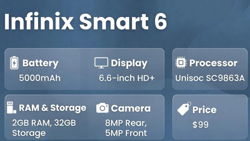 Infinix Smart 6 infographic – key specs, battery, display, camera, and price review (2025)